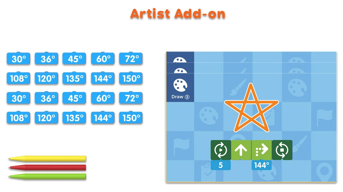 Mit diesem genialen Set können Sie den Programmierspaß mit Ihrem MatataLab Coding-Roboter erweitern: Enthalten Sind Winkelbausteine, die die Lieblingsformen (Sterne, Quadrate und andere Formen) der Kinder mit Hilfe des Roboters auf das Papier zeichnet. Setzen Sie einer der drei mitgelieferten Filzstifte in den Roboter und der Spaß beginnt. Ebenfalls enthalten sind 3 Karten mit 6 Beispielen.